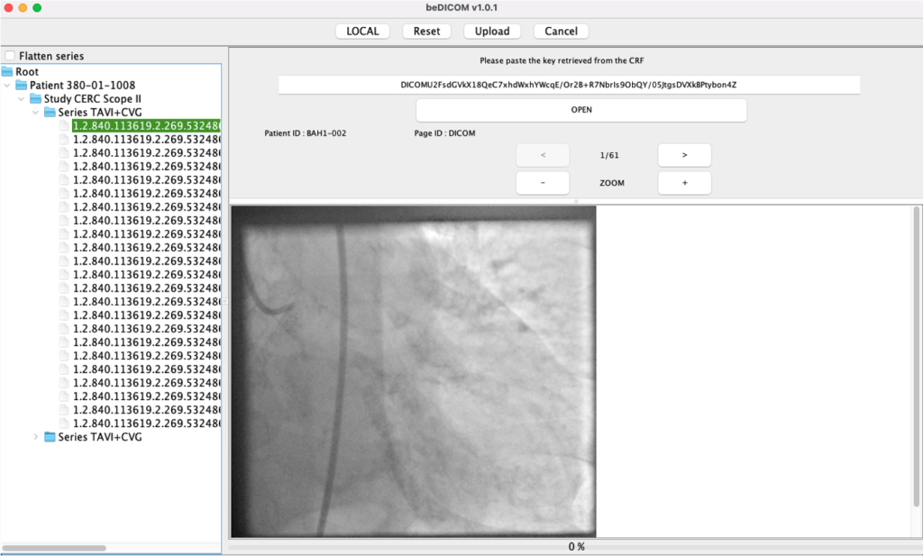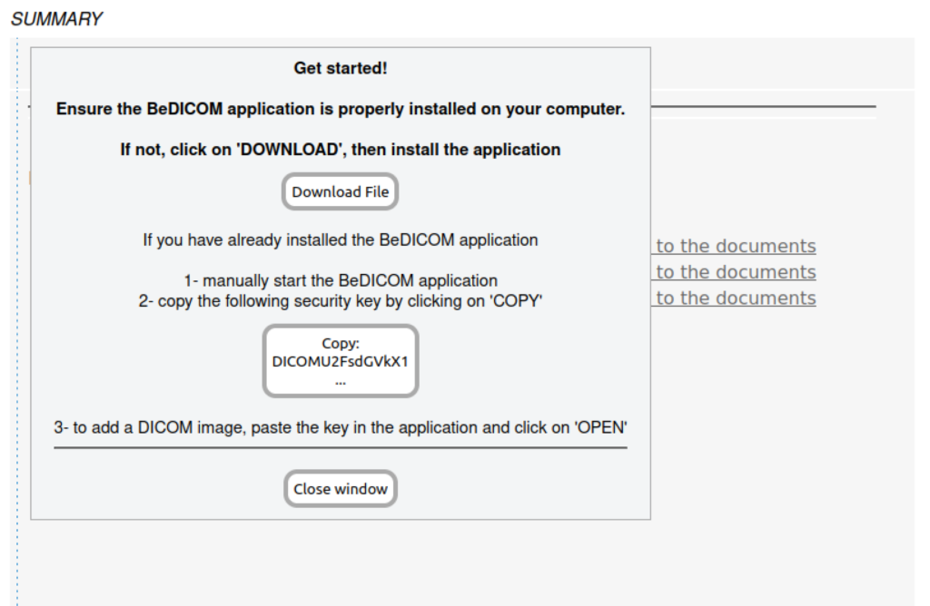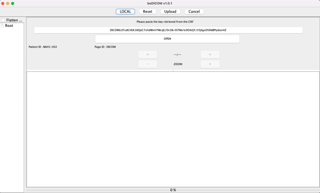 Launch beDICOM app from the computer. Copy the key link from your eCRF Dicom popup and paste it on the key field of beDICOM.