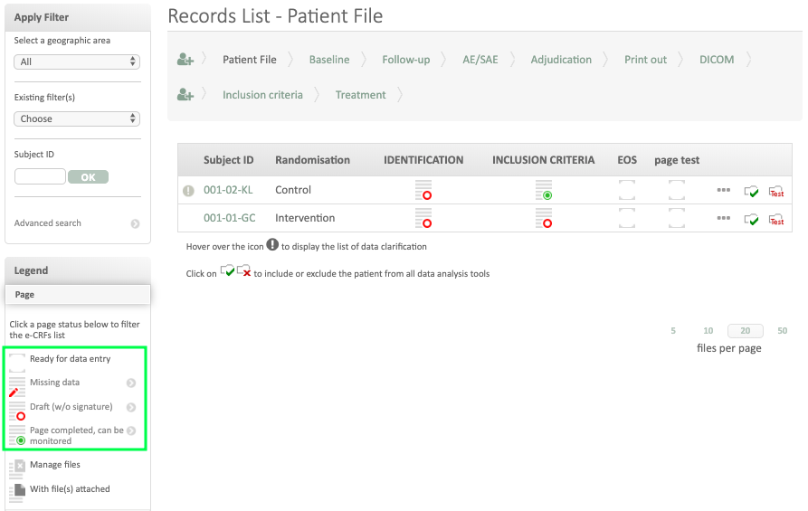 The eCRF pages can have different status. Each status is easy to identify in the patients lists through a specific icon. The legend of each icon is indicated as shown below.