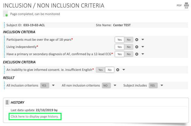 The monitor can access to the eCRF page history by clicking on the link located at the bottom of each page as shown below.