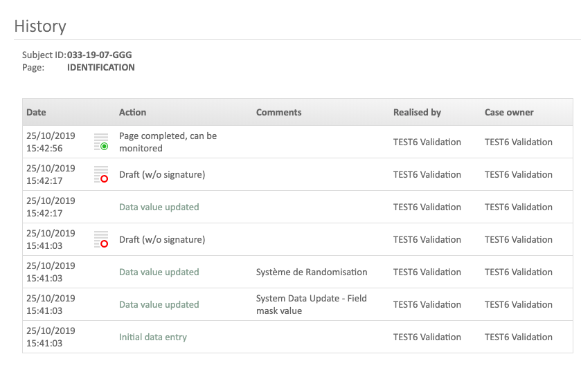 - Action – What kind of action has been performed (initial data entry, page completed, draft page, page monitored…)