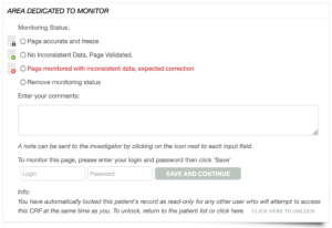 Once the page has been completed and signed by the investigator, the monitor can monitor the whole page data filling the specific « Area dedicated to monitor » displayed at the bottom of the page.