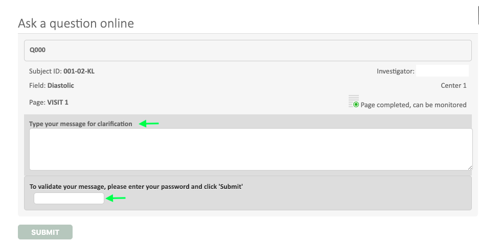 After data verification, a monitor can create a manual query associated to any field of the eCRF by clicking on the arrow aside the concerned field (as shown below) and select discrepancy note.