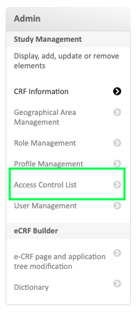 The “Access control list” option allows the user to define and modify all the access rights of the eCRF tool users.