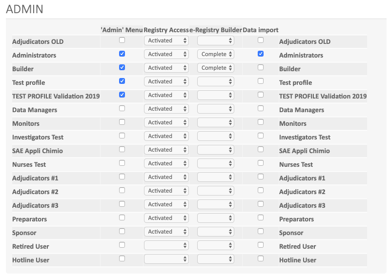 For each eCRF feature, the user will determine the access rights for each kind of user profile.