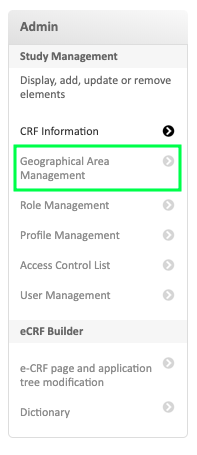 The « Geographical area management » is then a key feature for user profile management. It allows to list and manage (create, delete and modify) all the centers involved in the study.