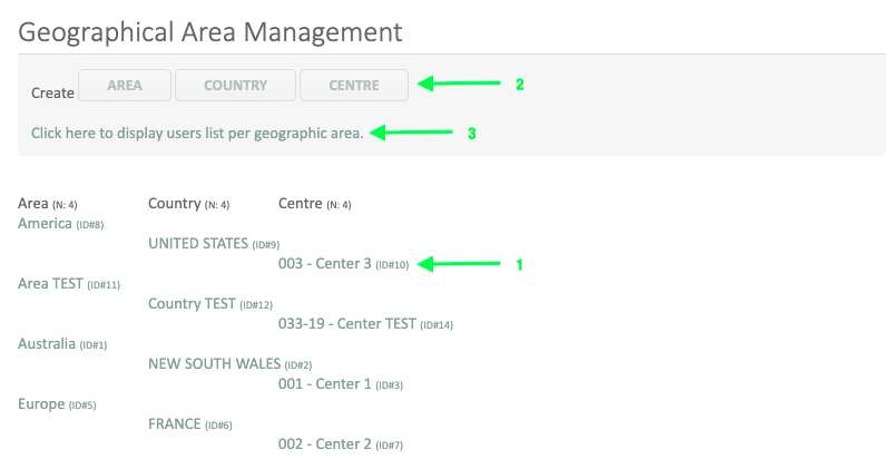 In order to edit a geographical area informations, just click on the name of the area (as indicated in 1).