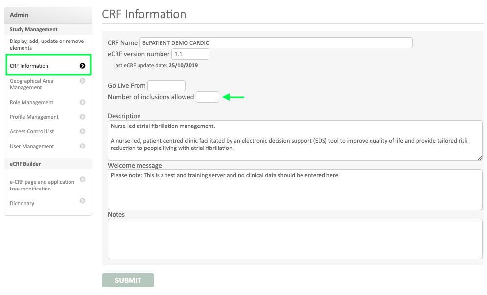 Then in the « CRF information » option, fill the item “Number of inclusions allowed” with the maximum number of subjects who can be included in the whole study all centers included. Finally Submit the modification.