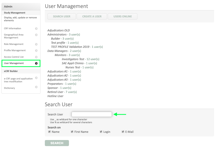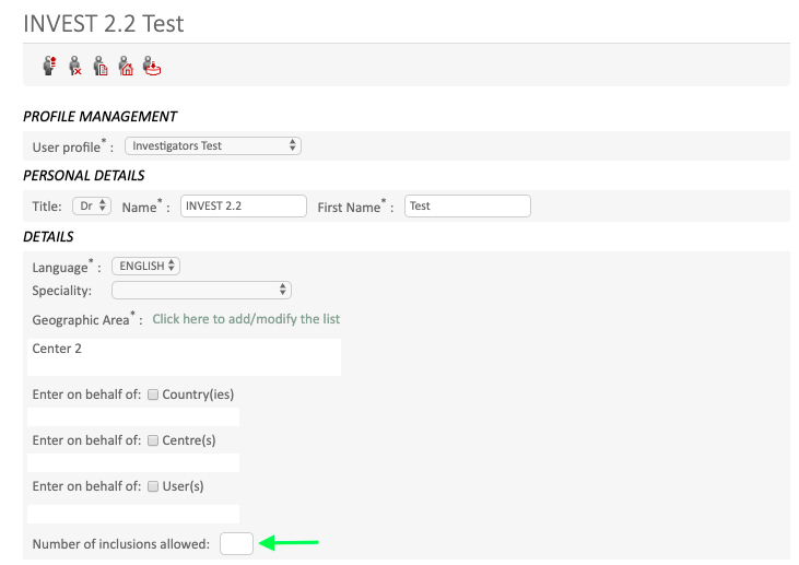In the « user management » option, select the specific investigator account for which the number of included subject should be limited (see below). The research module of the specific user account can be useful for this step.