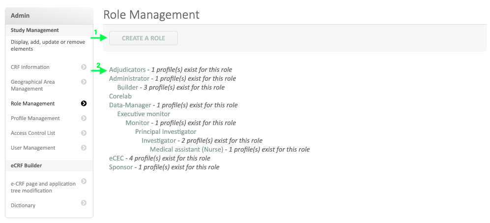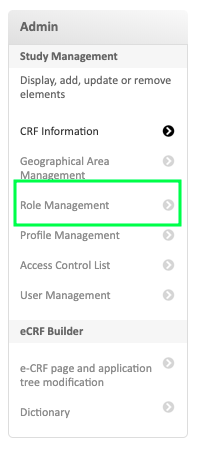 The « Role management » option allows the user to create, modify or delete the specific user roles involved in the study (depending on user access rights).