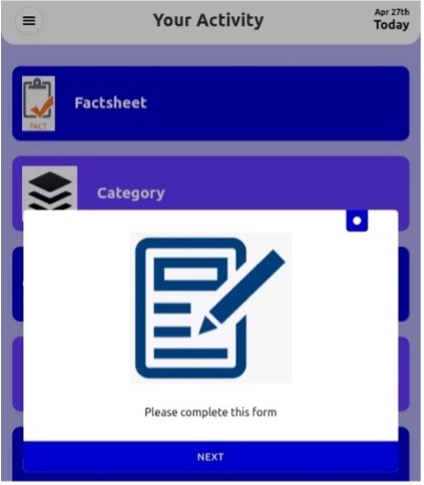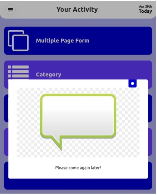 A blocking popup can be used when patient completes the activity, and it shows the blocking popup with a message “come next week” and screen is frozen.