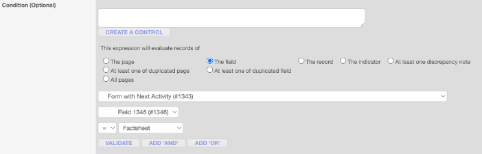 Step 3: From Condition (Optional) click on CREATE A CONTROL button, Select The field option, From in the page dropdown select “Form with next activity (#1343)”, Select “Field 1346 (#1346)” from the dropdown, Select Factsheet, Click on VALIDATE and SUBMIT