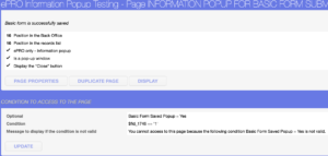 If you want to create a popup you can use ePRO only – Information popup template. You can add a condition when to show a popup. In the given screenshot, Condition is created to display the popup when the basic form is saved (page 1048 is the basic form page id).