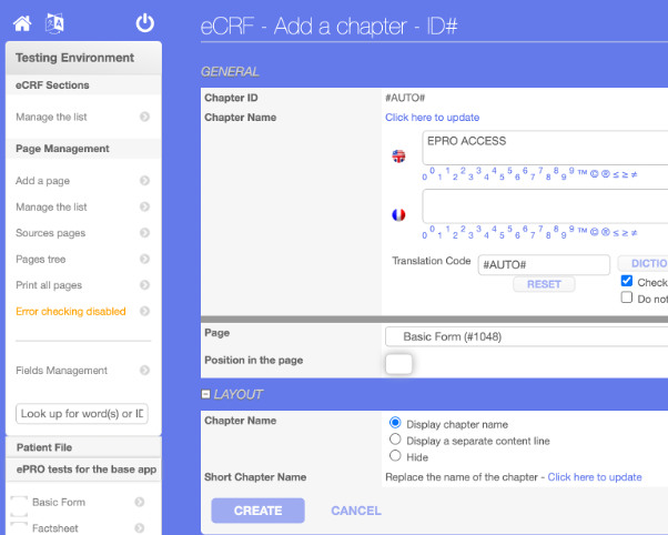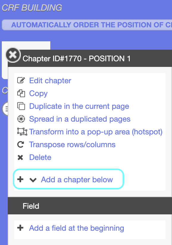 Step 1: To add a chapter in a Page, click on the Chapter Icon, which is Under CRF BUILDING, it will open the Menu, Select Add a chapter below option