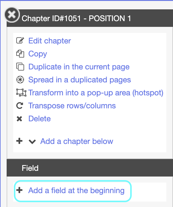 Step 3: To add a field under chapter, click on chapter menu icon and select “Add a field at the beginning”