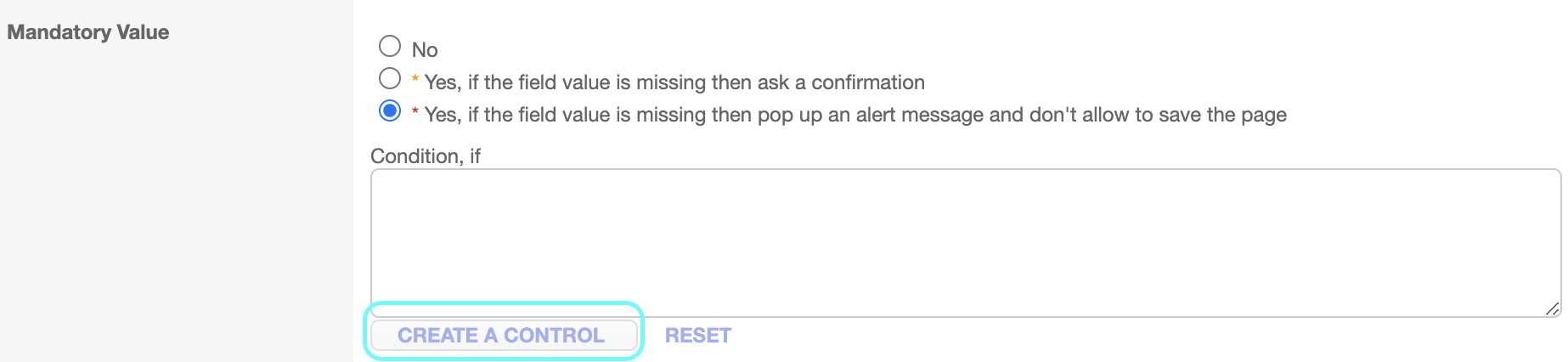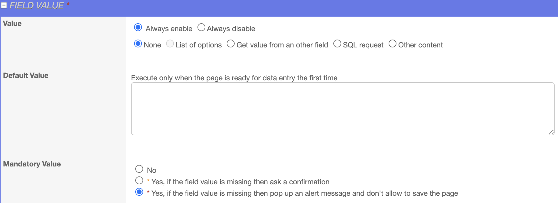 To set the required field mandatory, under the field value section, select « Yes, if the field value is missing then pop up an alert message and don’t allow to save the page » this will make the required field mandatory, and it will be highlighted in the red in the back-office page.