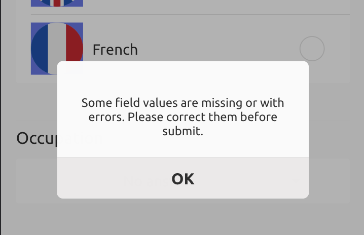 In the front end if this field is kept blank and we try to save the form it will show a popup message and the required field will be highlighted in red. When mandatory value is set to ‘No’ it will display the field as optional.