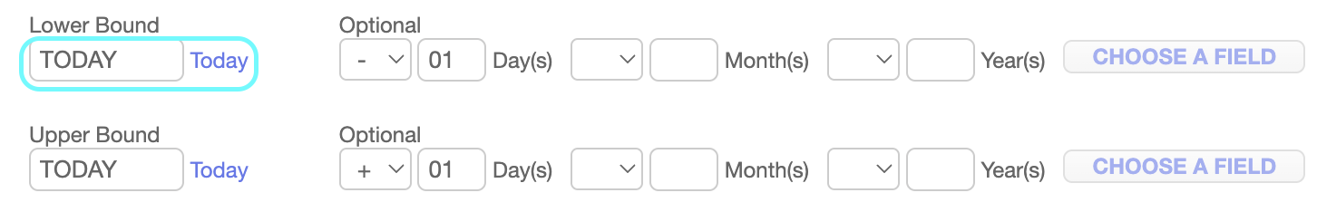 Step 2: You can set today’s date by clicking on the today link in lower bound and upper bound or by selecting days, months, and years, these fields are used to set the boundary condition and it displays error if the date is outside the boundary conditions.