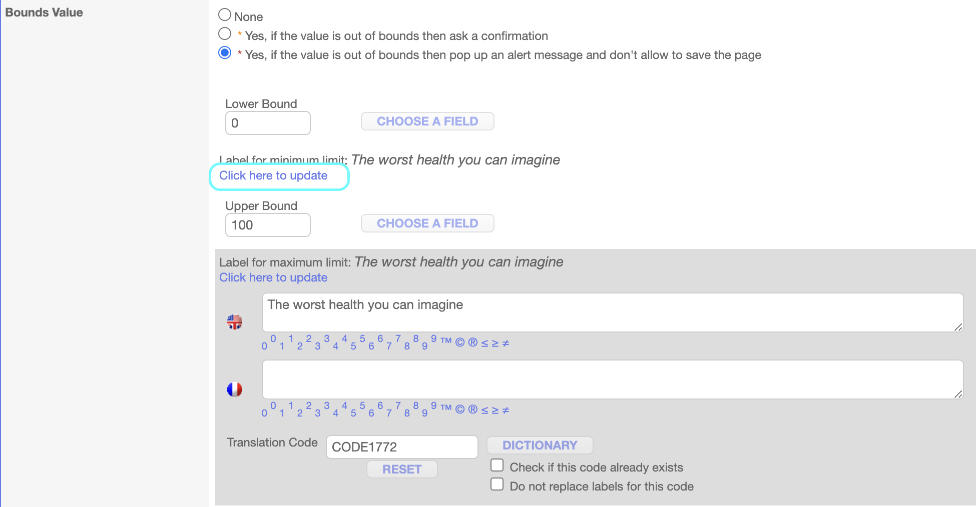 For the EQ5D Slider, you can add the label for the lower bound and upper bound, click on Click here to update link and enter the message in English and French language.
