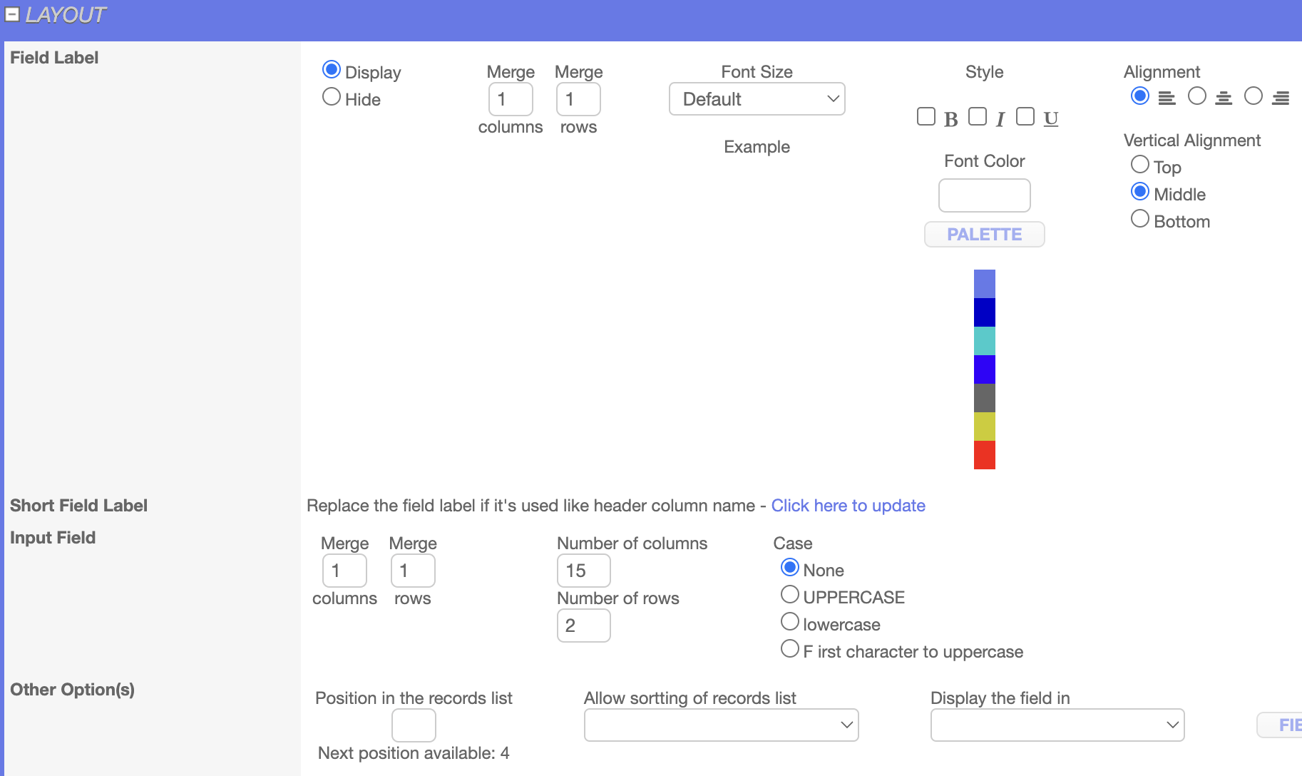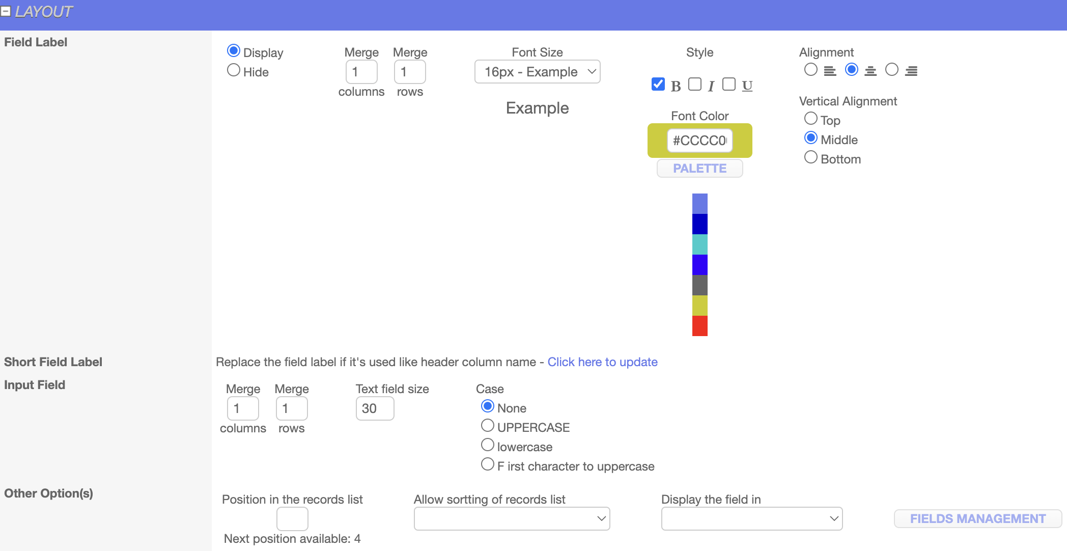For the text field, you can set the font color, size, style, alignment, and position from the Layout, also you can set the field value based on the condition if that field is required then set “Yes, if the field value is missing then pop up an alert message and don’t allow to save the page” option under field value section.