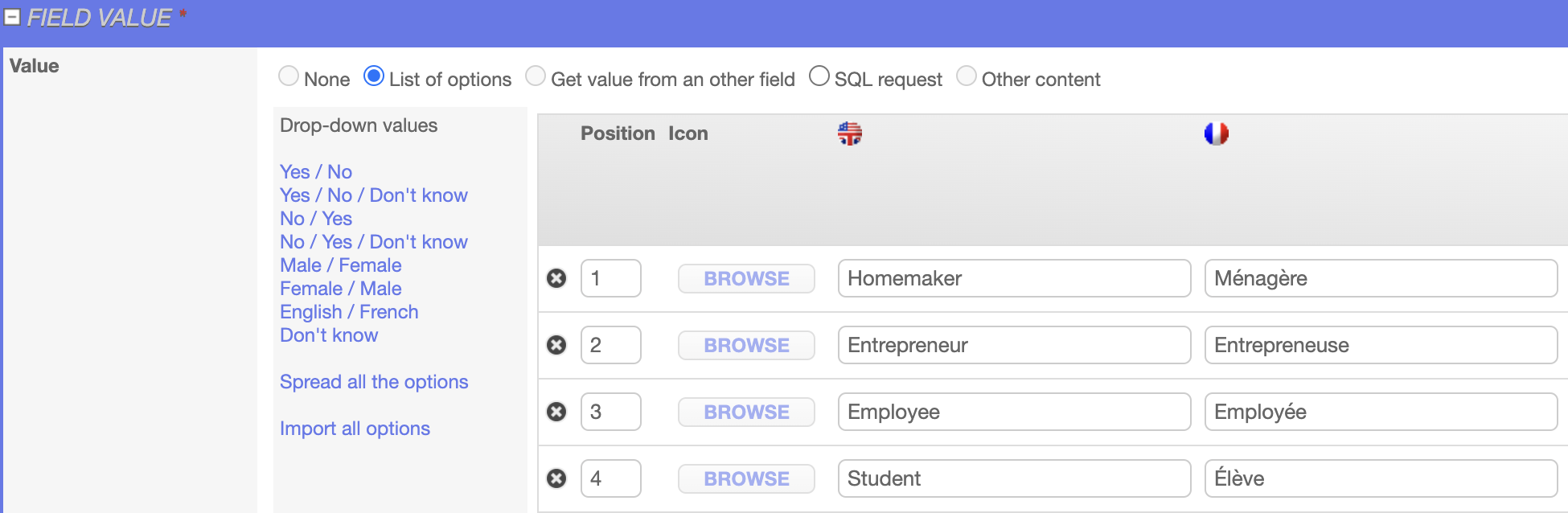 To display the option under the dropdown list, In the field value you can enter the option one after another.