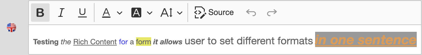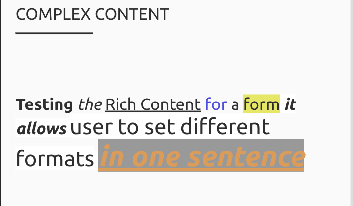 Rich content allows you to set different formats in one sentence such as half of the sentence can be bold with big fonts and another half of the sentence can be italic with different font colors.