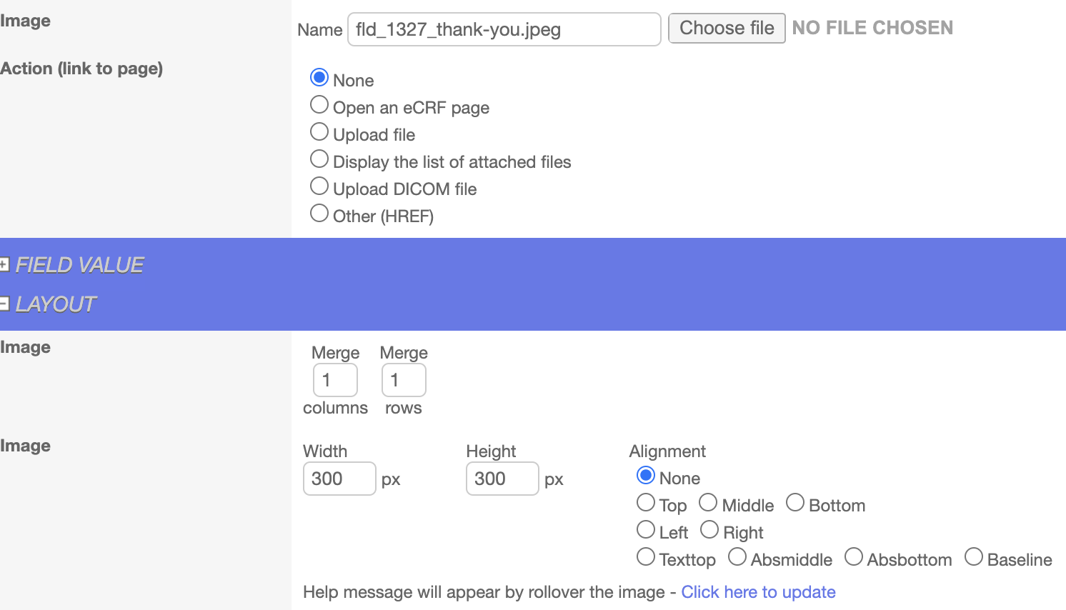 The image field allows you to upload the images in .png, .svg, .jpg format, from the layout you can set the image size (height, width, or alignment).