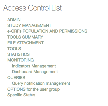 Access rights can be configured for each eCRF profile, modules and CRF access. You can find access rights configuration in the admin module. You can either modify access right in the « Access Control List » or in the « Profile Management » parameters.