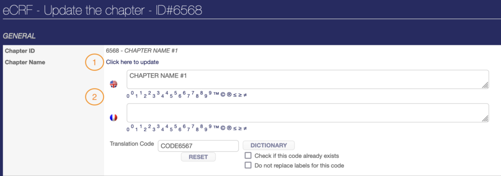 You can add or change the chapter name. For some projects, several languages may be activated. In this case, for each label, you’ll find several boxes to add the translation. Each language box is associated with the country flag. Here, the first box corresponds to English and the second to French.