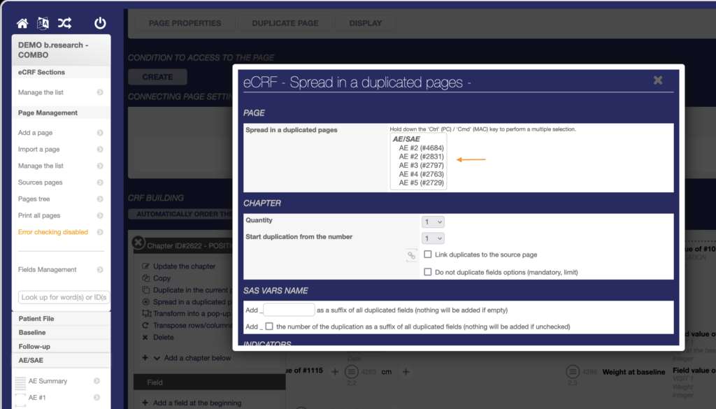 Duplicated fields (with SAS VAR NAME) in duplicated chapters should be linked to the source fields in the source chapter for the exports to be correct. Therefore, the option « Link duplicates to source page » should be checked.