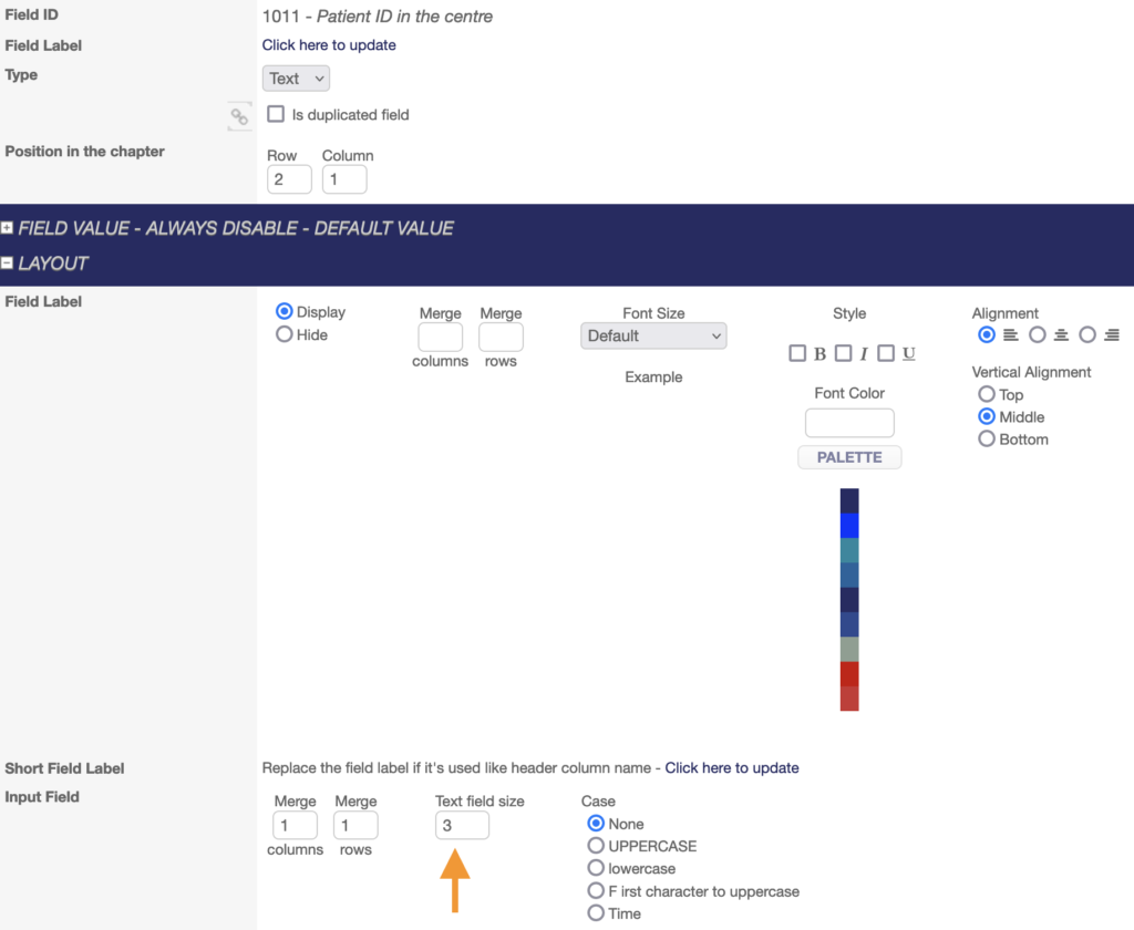 Once the additional text fields have been added, the Patient ID field can be configured. As the format in our example is XXX-YYY, the field size must be 7 (3 digits for the centre ID, 1 digit for the dash/hyphen, 3 digits for the increment number).