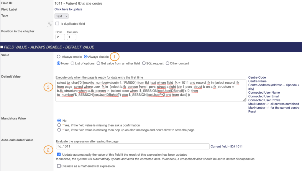 This field must be configured as ALWAYS DISABLED (1). The DEFAULT VALUE box must contain the expression below related to the Centre Code. To add it, click on “Centre Code” to the right of the box (2).