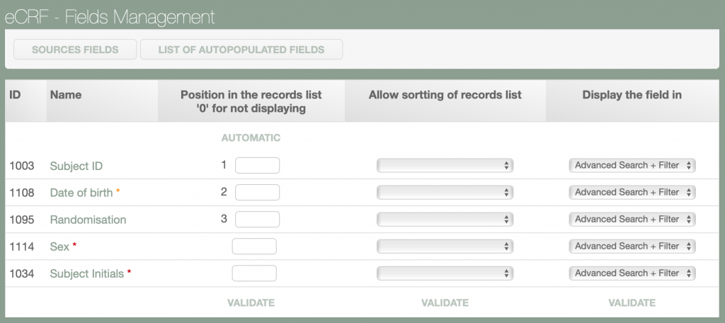 You can also access the fields management by clicking on « fields management » (on the field properties or directly through the top left back-office menu) and parameters fields positions and options in the patient list. Click on « Validate » once you want to save the new configuration.
