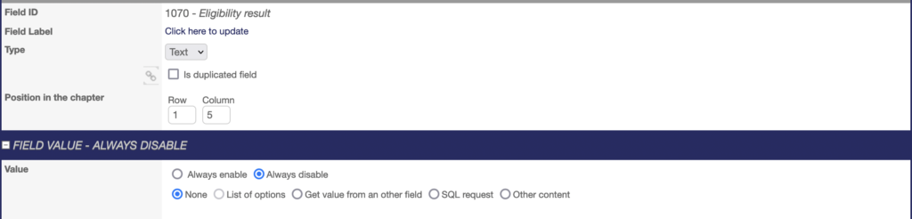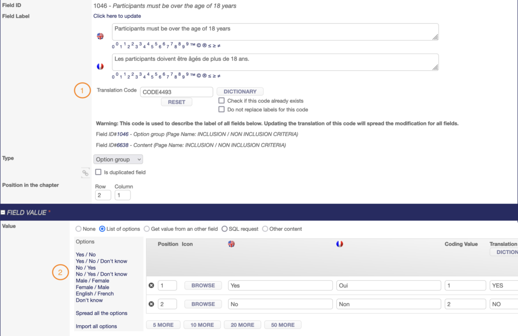 - an option group field defined as mandatory value in the FIELD VALUE part on the line below with the label of the criterion (use the same Translation Code as for the content field), the « Yes » and « No » options and the SAS VAR NAME.