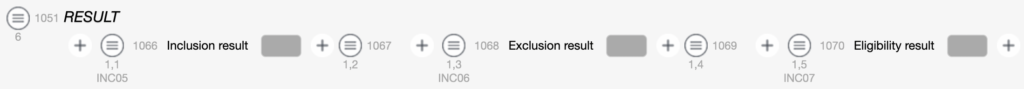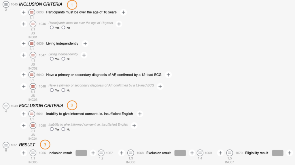 Start by 3 chapters: the first called INCLUSION CRITERIA (1) will contain all the inclusion criteria, the second called EXCLUSION CRITERIA (2) will contain all the exclusion criteria and the third called ELIGIBILITY RESULT (3) will contain the 3 fields to calculate the eligibility result.