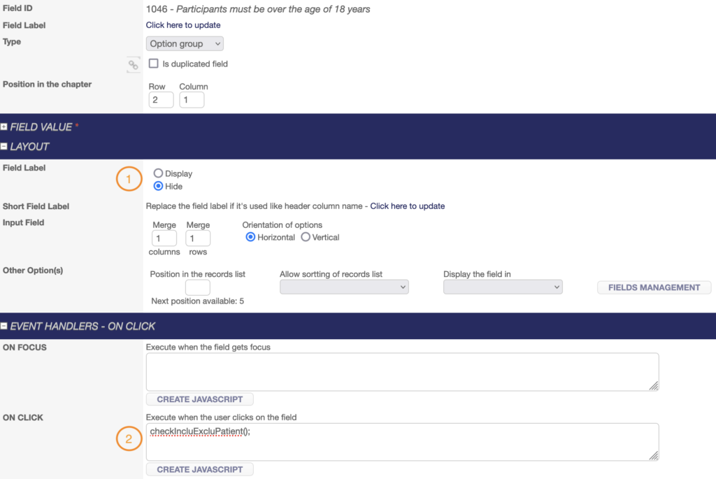 - Set the label of the option group as HIDDEN in the LAYOUT part and add the expression checkIncluExcluPatient(); in the EVENT HANDLERS part – ON CLICK box.
