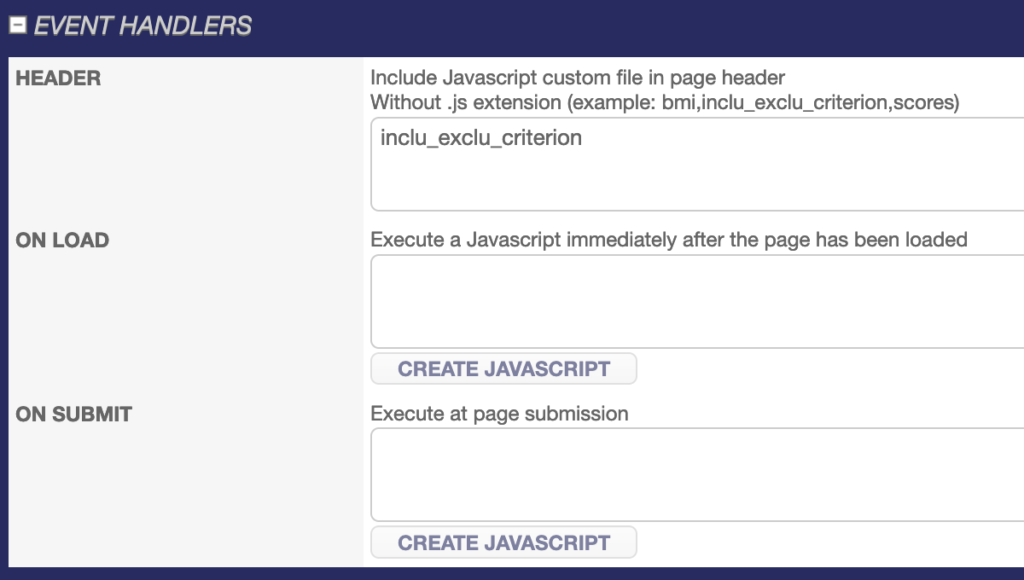 Once the algorithm is set up in the eCRF, click on PAGE PROPERTIES on the selection criteria page and add « inclu_exclu_criterion » in the HEADER insert of the EVENT HANDLER.