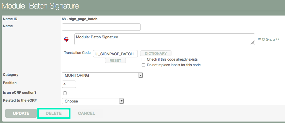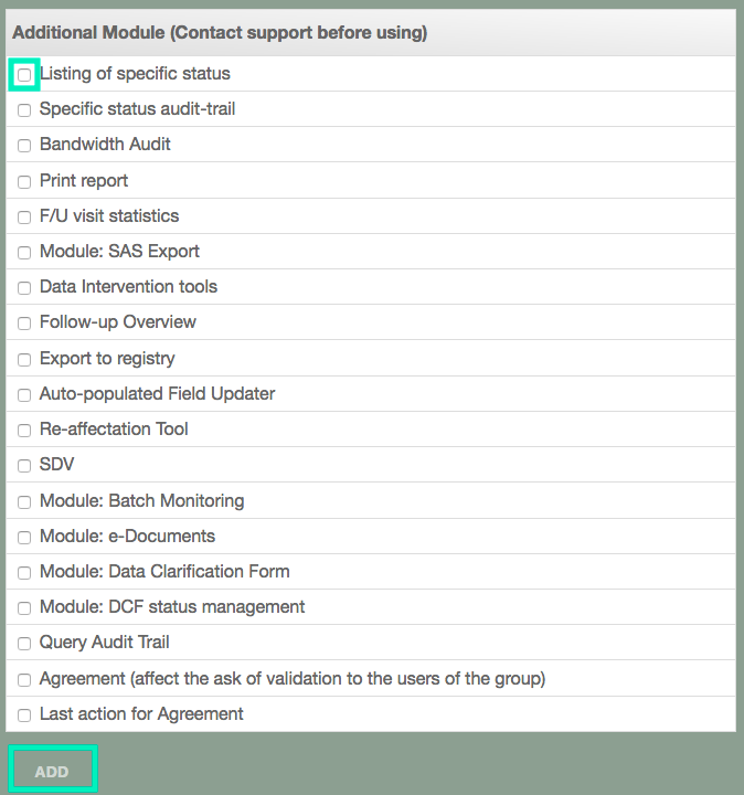 Once you are on the building tool welcome page, you can access the module of addition and deletion of eCRF module by cliking on « Add/delete module » :