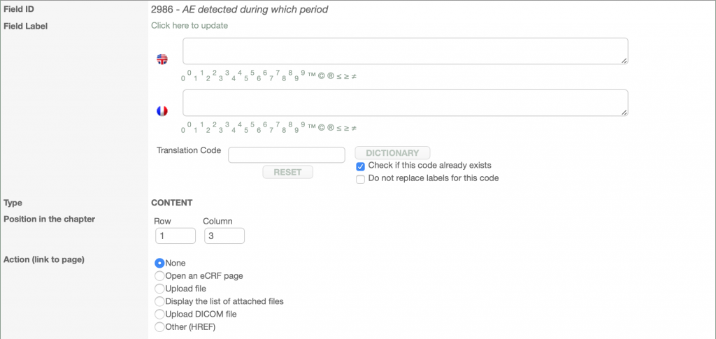 In a multi-lingual eCRF, each label of sections, pages, chapters, fields,… will be defined for each language (see below).