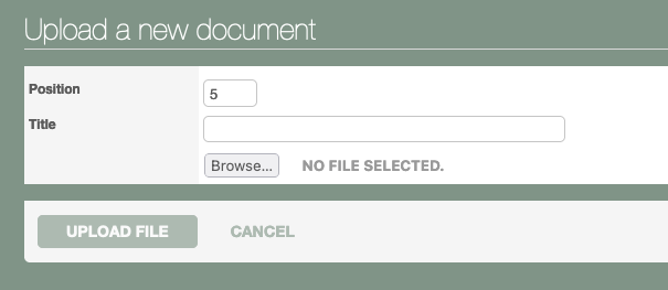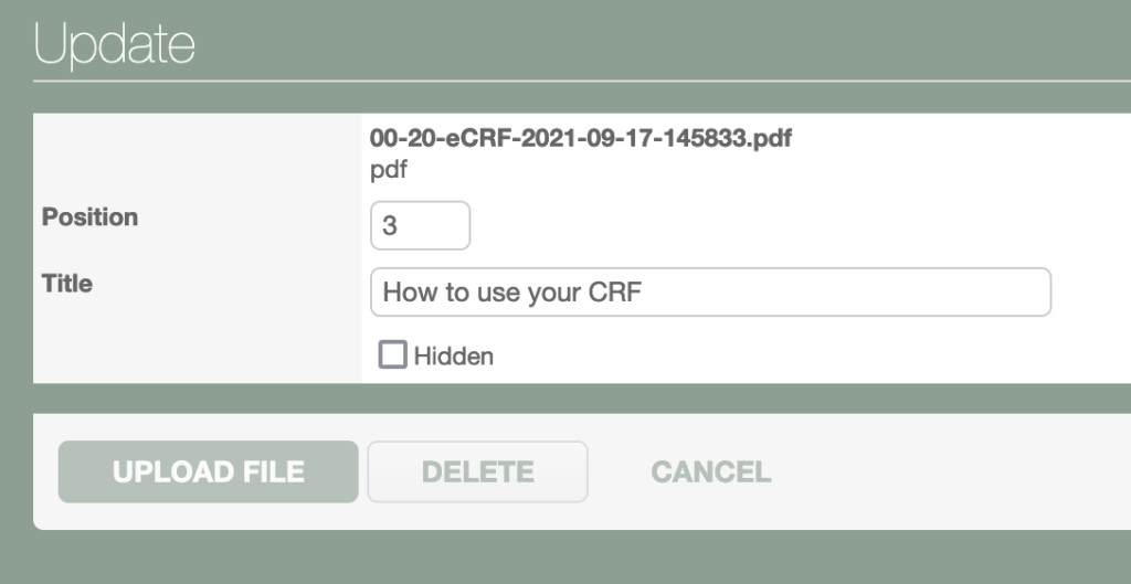 After upload, clicking on the title will allow update : rename the file, change the position on the list, hide the file to user or delete the document