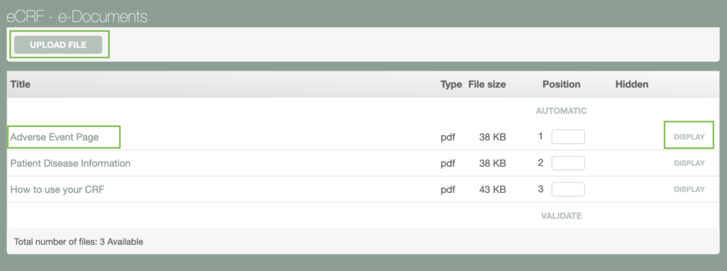 e-Document configuration allow to upload document from the CRF Building using Upload button. Select your file and select the position on the e-Document list, title is optional and will be copy the file name is empty.