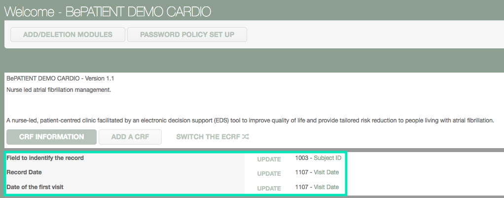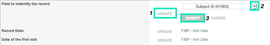 When you want to assign a field or update the field assign to the patient ID, record date or first visit you first need to click on update, choose the field you want to assign in the proposed list and click on submit.