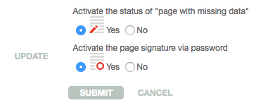 You can decide either to activate page status « page with missing data » and the page signature with password or not by choosing yes/no and clicking on SUBMIT.