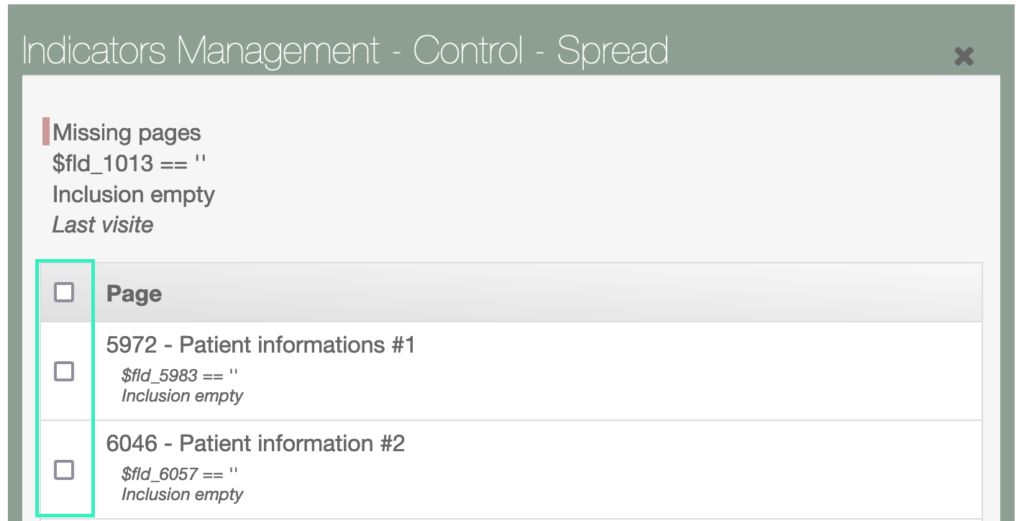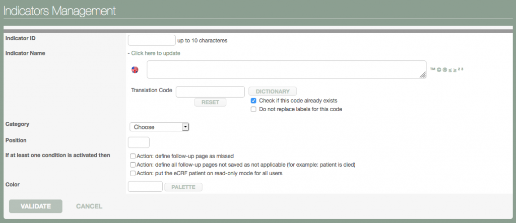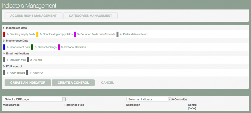 Indicators are made to help Monitors, Data Managers and Investigators quickly identify a patient who enters a condition. These indicators are different from one study to another and are set up in the back office of the SMART platform to facilitate the study monitoring.