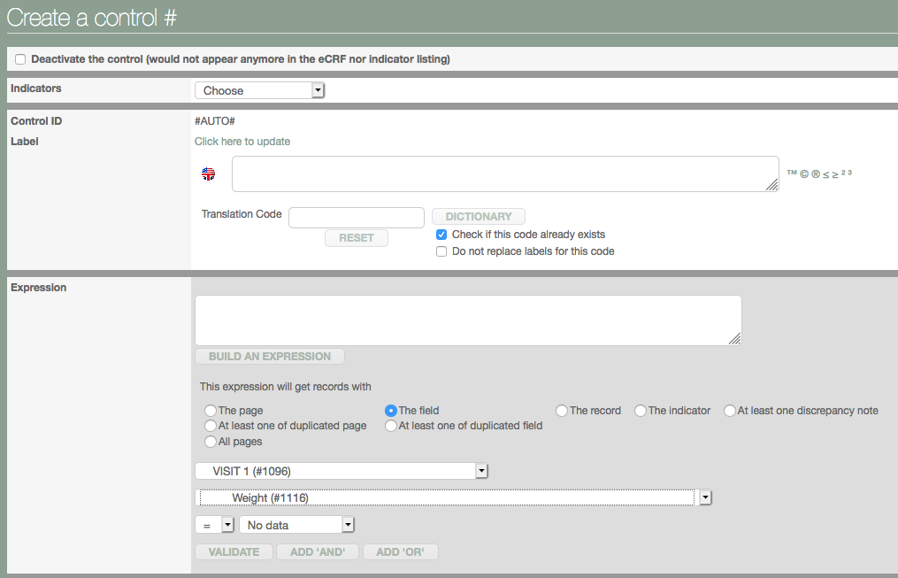 2/ The creation of the condition of the new indicator clicking in « Create a control »