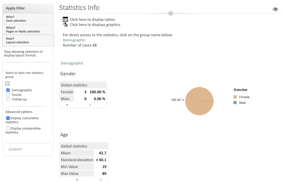 The « Statistics » module provides a descriptive statistical view of the subjects included in the study and of the data of interest for the user. This module is fully customised to each user profile request and needs.