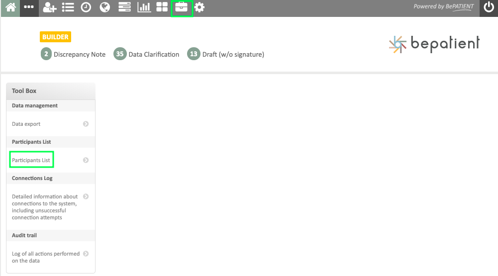 The “Participants List” module provides a real-time view of all the users who have a specific profile in the eCRF tool.