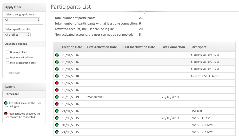 Clicking on “Display with default filter parameter”: the participants list is displayed by default.