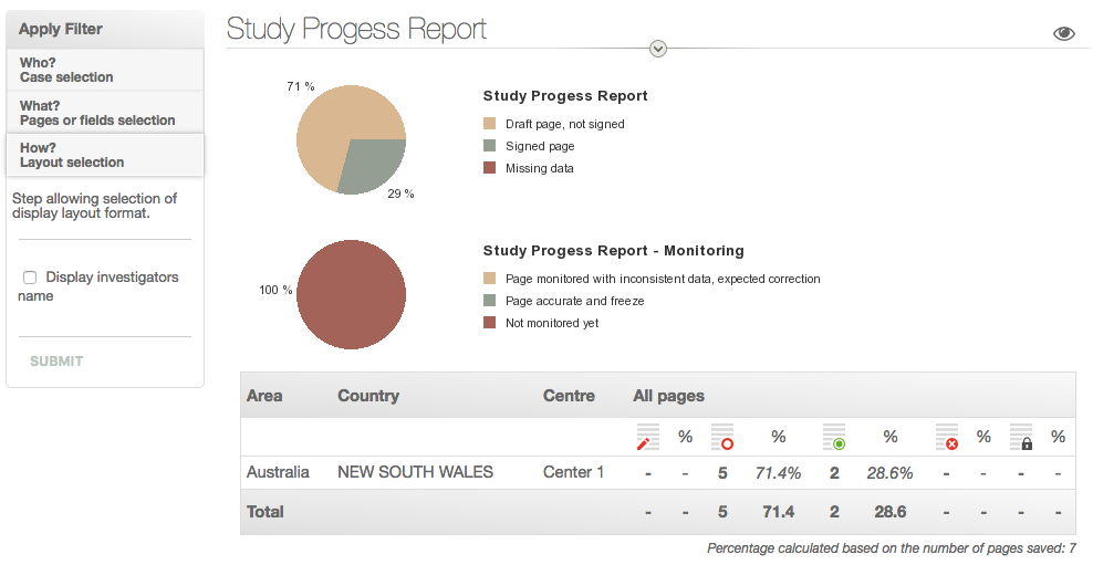 This module allows to monitor the progress of the study by the statistical visualisation of the number and percentage of pages filled, signed and monitored in the study for each center.